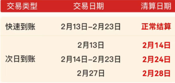 【星驿付】2026年春节结算通知 发布时间:2026-02-12 分类: 问题解答 阅读:5476 您好!根据《国务院办公厅关于2026年部分节假日安排》的通知,2026年春节放假时间2月15日至2月23日,共9天。假期期间交易资金的清结算安排告知如下: 由于2月24日当天需将多日的交易款统一结算,清算量较大,因此可能会存在延迟到账的情况,请您耐心等待。如您有疑问,可联系在线客服,我们会尽快为您处理。 感谢您对我司的支持,祝您春节快乐! 本文由星驿付pos机原创内容转载请标明出: 【星驿付】2026年春节结算通知 上一篇 星驿付电签版 POS 机凭借其丰富的支付功能 下一篇 星驿付微智能POS机优势